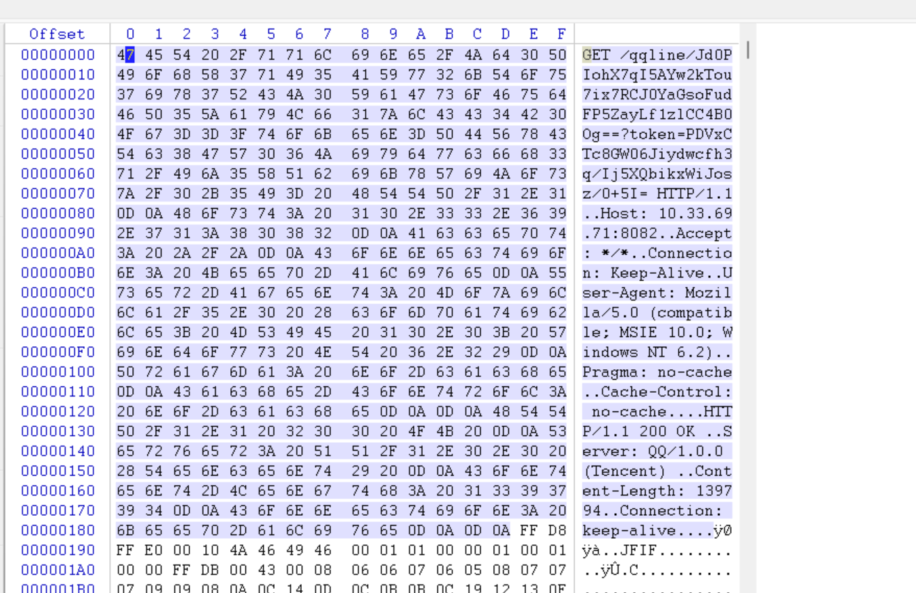 原始数据jpg文件是打不开的,因为QQ照片通过TCP流传输时,照片数据会和TCP协议的控制信息、QQ应用层的额外标识数据等混杂在一起