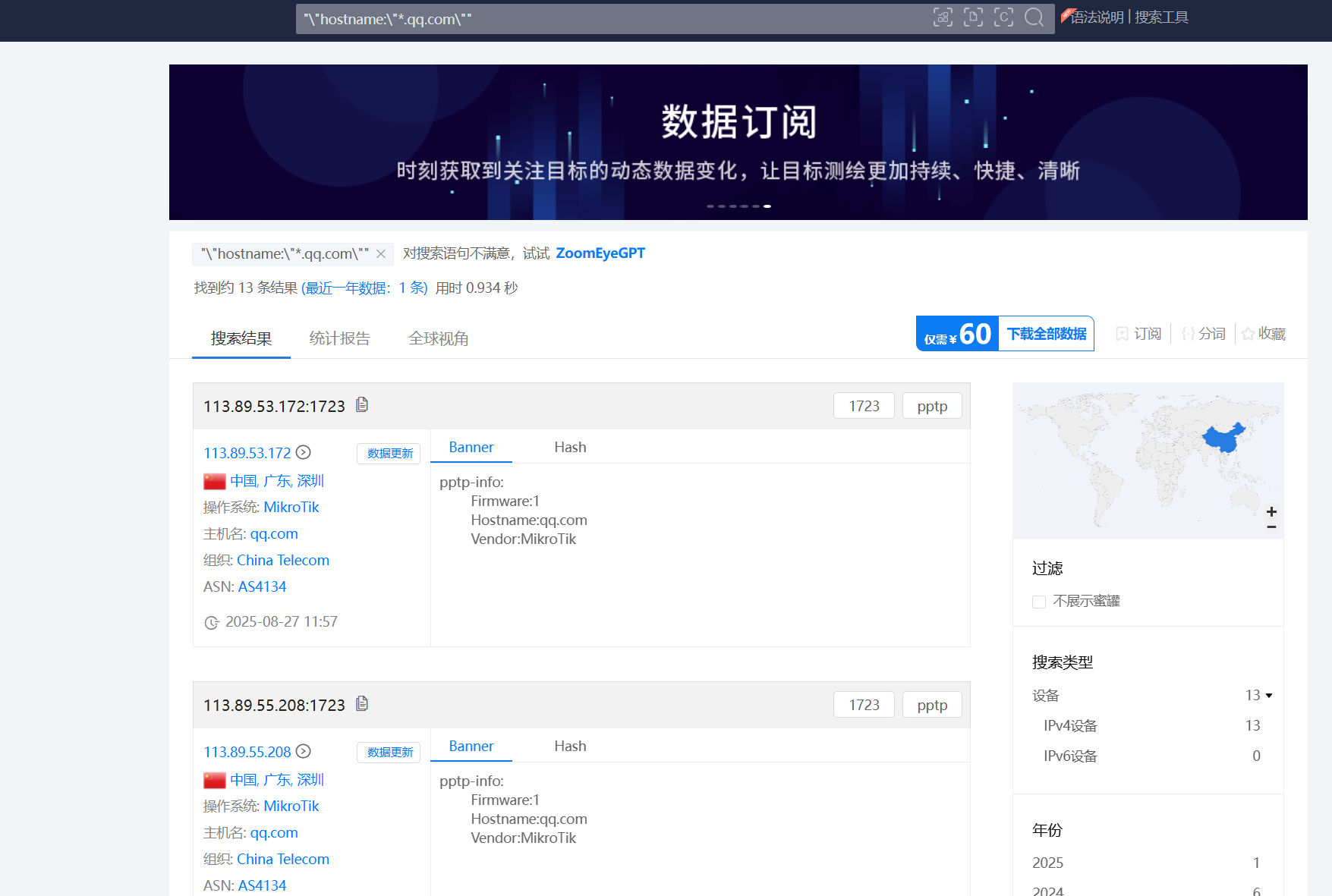 统计数据与可视化:提供全球或特定目标的设备、服务分布统计图,便于进行宏观趋势分析。